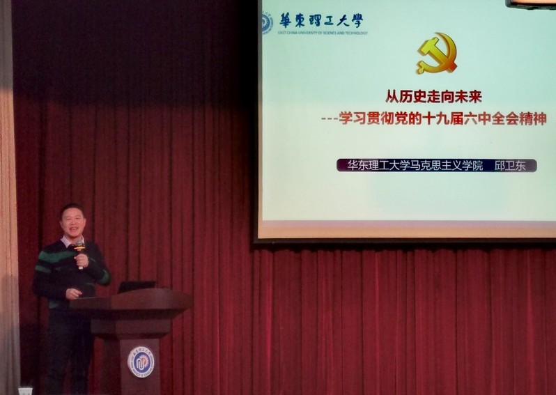 为进一步引导全院师生深入领会党的十九届六中全会精神,切实把思想和行动统一到党中央重大决策部署上来,12月24日下午,德赢winac米兰党委组织全体教职工在校工会八角亭二楼进行集中理论学习。华东理工大学学习贯彻党的十九届六中全会精神宣讲团成员、马克思主义学院副院长邱卫东副教授应邀作了题为“从历史走向未来”的专题辅导报告。报告会由德赢winac米兰党委书记钮月萍主持。