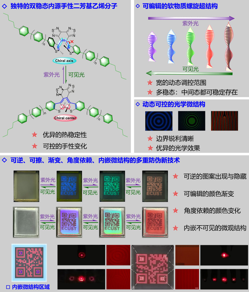 为了解决上述问题,该工作基于朱为宏课题组所发展的独特“位阻性烯桥光控体系”,发展了一类双稳态内源手性二芳基乙烯分子。与外接手性基团所带来的手性调控相比,内源手性的转变仅来自于开环体的轴手性与闭环体的中心手性之间的变化,非常有效地避免了含有多手性源的非对映异构体的产生,从分子设计源头创新解决了液晶微腔中的多畴结构问题。此外,通过在侧链修饰类似液晶单体的结构单元,进一步提升了光控分子与液晶的相容性、螺旋扭曲变量(HTP)、热稳定性以及抗疲劳度。该类内源手性光控开关完美解决了软物质光子学中动态调控范围窄、结构稳定性弱、抗疲劳度差、光散射和光谱畸形等问题,突破性地实现了从近紫外到近红外区的宽范围、多稳态、强抗疲劳度的动态调控,并开创了可逆、可擦、渐变、角度依赖、内嵌式微结构的多重防伪新技术,有力推进了防伪领域新时代的发展。