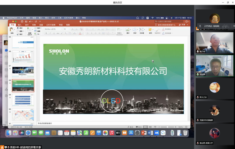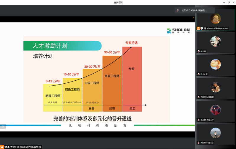 2022年春招已然如火如荼地进行着,虽然受到一点疫情地影响,但同学们求职和公司求才热情依然高涨。在德赢winac米兰郑致刚院长的支持下,安徽秀朗新材料科技有限公司第一时间响应,并于3月17日晚上召开了线上专场招聘会。参加会议的有秀朗新材庞玉东,郑秀娜,郭涵琦等一行,德赢winac米兰副院长(主持工作)郑致刚教授,党委副书记王莉,毕业班辅导员杨少明,以及众多2022届毕业生。