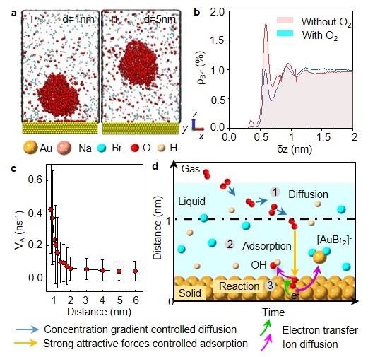 方海平教授团队利用经典分子动力学和第一性原理分子动力学模拟指出,纳米气泡的存在并未影响溴离子在金纳米棒的表面的吸附位置,而纳米气泡中释放的氧气分子在金纳米棒表面吸附是加速反应的关键。当纳米气泡与金纳米棒表面之间液层的厚度大于~1 nm时,纳米气泡所释放的氧气分子通过浓度梯度主导的扩散穿过液层到达金纳米棒表面,此过程速度较慢。但当纳米气泡与金纳米棒表面之间液层的厚度减小到~1nm以内时,氧气分子的输运过程具有“类遂穿”效应,氧气分子以极高速度穿过液层吸附到金纳米棒表面,从而极大地加速了刻蚀反应。