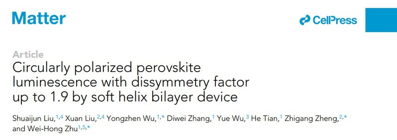 近日,德赢化学与分子工程学院朱为宏教授、吴永真教授和德赢winac米兰郑致刚教授团队合作在圆偏振钙钛矿发光研究方面取得进展,相关成果以“Circularly Polarized Perovskite Luminescence withDissymmetry Factor up to 1.9 by Soft Helix Bilayer Device”发表在知名期刊Matter上。