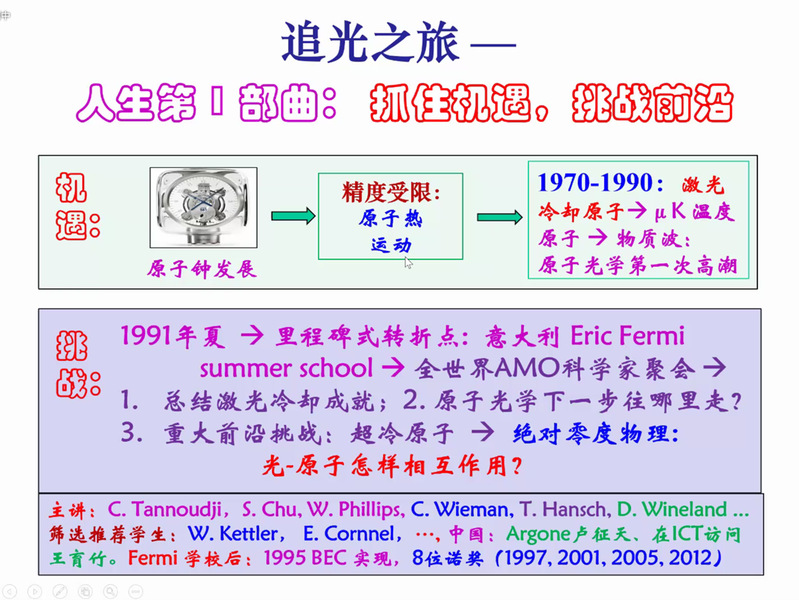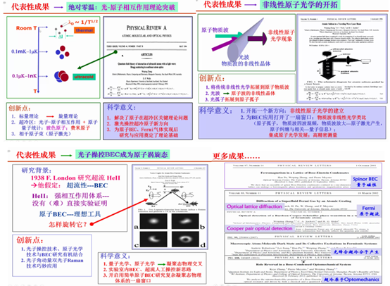 随后,张卫平教授回顾了他在研究生求学、国外学习及任教、回国组建团队、从理论到实验等诸多关键时刻的机遇抉择、挑战应对以及痴迷和求索,并同步介绍了他和他的团队取得的一系列突破:旋量理论解决超冷区光与原子的相互作用、非线性原子光学的开拓、光子操控BEC成为原子涡旋态、新型原子干涉仪等等,揭示了量子光学和原子光学在量子操控新层次下的有机融合以及推动量子精密测量等量子技术的创新成果。