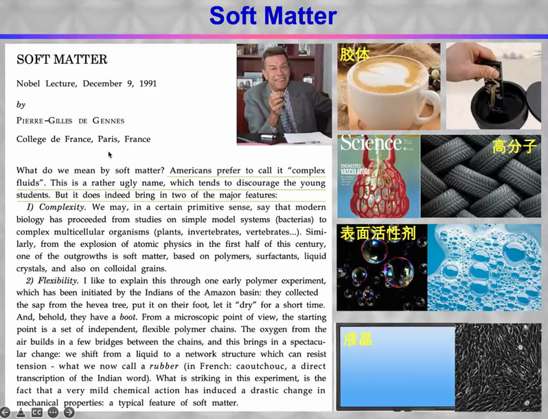 韦齐和教授首先介绍了凝聚态物理下的软物质(soft matter)研究领域的科研概况,包括胶体,高分子材料,表面活性剂,液晶,生物材料,肥皂泡等等。