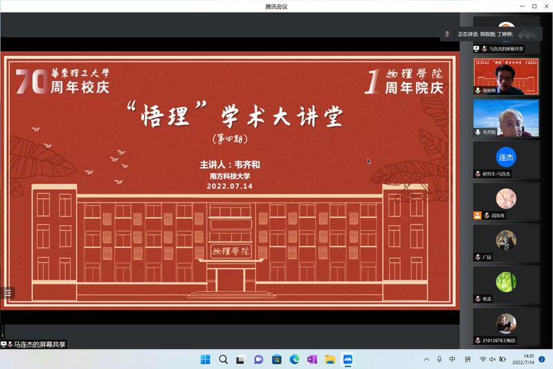 为庆祝华东理工大学70周年校庆暨德赢winac米兰1周年院庆,作为校科技活动周系列讲座,德赢winac米兰主办的“悟理”学术大讲堂第四期于7月14日成功举行。本次大讲堂邀请到南方科技大学韦齐和教授带来了题为“软物质的微纳调控和应用”的学术报告,韦齐和教授为国际光学工程学会会士, 曾是德国洪堡学者和美国国家自然科学基金会CAREER奖的获得者。此次报告由德赢winac米兰郑致刚教授主持,近200名师生在线聆听了此次报告。