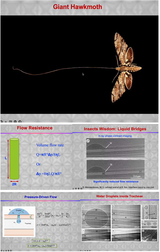 生物科学也是软物质科学的重要课题。韦教授团队还将目光投到达尔文预言中“舌头长达35厘米”的长喙天蛾身上。发现这种飞蛾为了适应生存环境,进化出了远超自身长度的口器,而为了吸取食物,它们会为口器中注入气柱,减小所需的压强差。而且口器内壁是超疏水性的,便于液体的运输。
