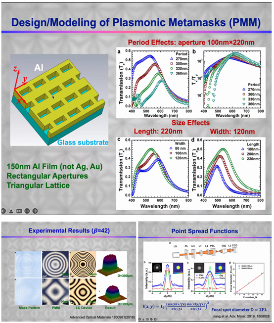 随后,韦教授介绍了团队在软物质研究领域中取得的研究突破。研究团队设计了一种超掩模板PMM,可以通过设计铝板上长方形的小孔排列的拓扑结构即能改变透光图像,从而实现液晶光配向(photoalignment),相比其他方法有更高的衍射精度和更高的透光率,且成本更低。利用这种超掩模板,韦教授团队还基于光学的斯奈尔定理的推广,实现了从高斯光束到平顶光甚至矩形平台光的光束整形(Beam Shaping)过程。以及后面搭建微透镜(Micro-Lenses),对微观粒子进行高精度观测。这种超掩膜板高分辨率分子取向图案化技术作为一项颠覆性的技术,可以解决液晶衍射光学元器件的设计与制造问题,还有很大的应用潜力尚待发掘。