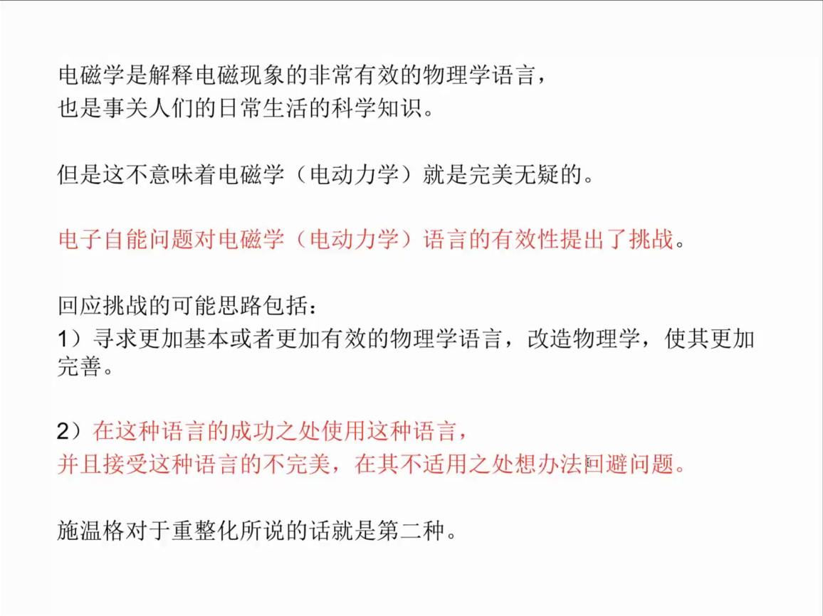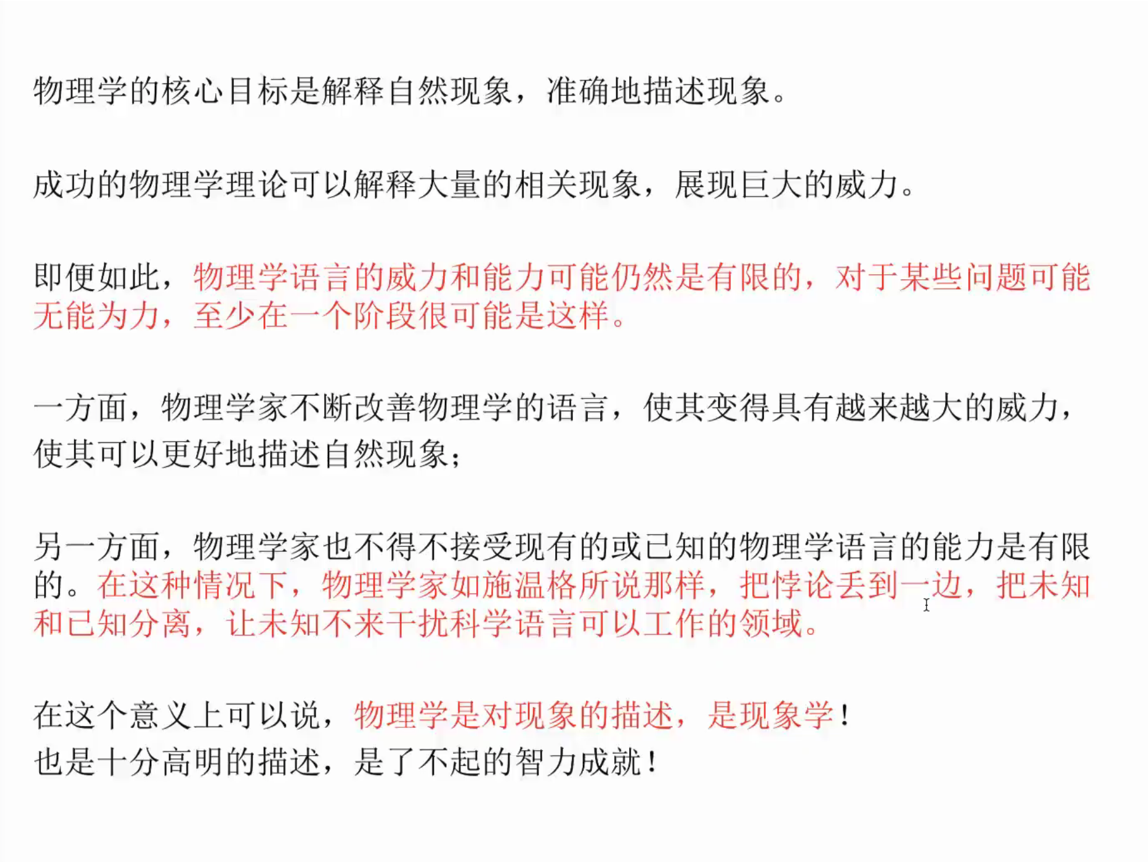 廖玮教授首先通过电子自能的问题告诉我们,物理学语言在其相关理论开始形成的时代不可避免的会有不完美之处,物理学中还有难以回答的问题存在,例如电子是什么。物理学家不得不接受现有的物理学是威力有限的,在这个意义上物理学所获得的是对现象的描述,物理学是现象学。又以物理学家对引力的理解为例,从超距作用形式的引力、引力场到引力几何化的转变,指出物理学对现象的解释具有多重性,并且指出物理学理论所具有的数学形式并不一定意味着其就是现实的“真实”。例如,具有超距作用形式的万有引力理论获得了巨大的成功,但这并不意味着引力是超距作用。作为对比,廖玮教授指出开普勒的太阳系模型试图使用几何模型得到行星轨道的比例关系,这是直接把数学的“真实”当作物理意义上的“真实”或客观现实上的“真实”的思想方法,这不是现代物理学的思想方法。在这个意义上,物理学是以模型描述现象,使用模型反映真实,但是并不一定就是真实。