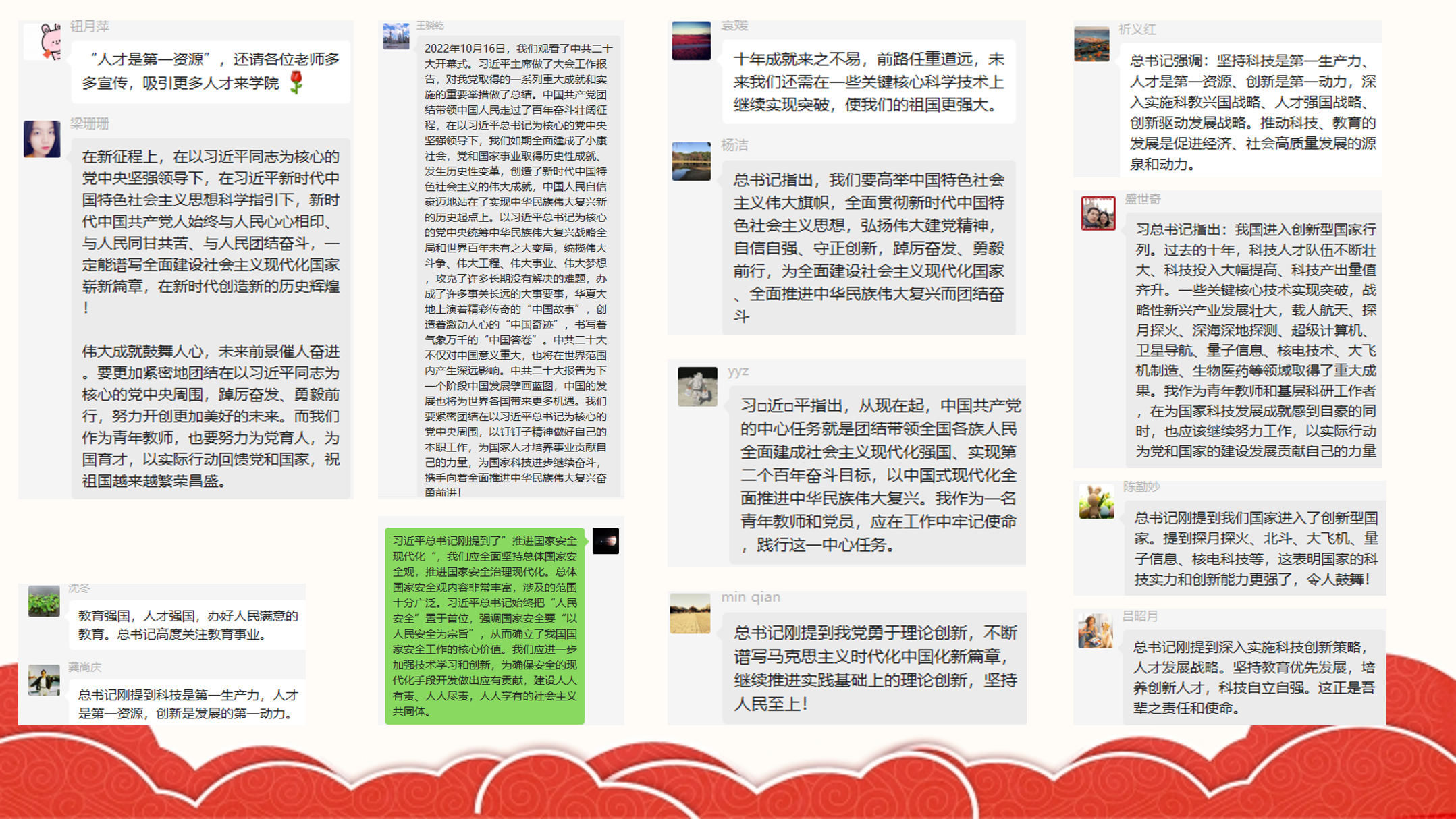 “认真听了习近平主席的二十大报告,报告重申了科教兴国战略,强调了教育优先发展、科技自立自强,促进教育公平,特别是实现共同富裕,核心是办好人民满意的教育。作为一名普通教育工作者倍受鼓舞,今后在本职工作中将始终坚持立德树人,为发展素质教育和人才培养尽自己的微薄之力。”