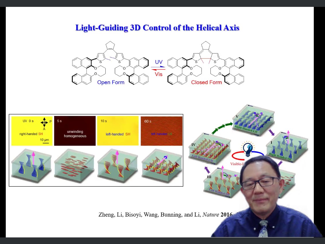 李全院士首先介绍到液晶材料不仅具有液体流动性还在一定程度上具有晶体结构,是材料的第四种形态,也是纳米技术的完美候选人。之后他从液晶概念阐释出发,重点介绍了近年来所带领的团队在智能液晶材料方面的重要研究进展,展示了纳米尺度组装有序的液晶智能材料的科学之美及其广泛的应用,包括可用于热成像、反射显示、可调谐彩色滤光器和无反光镜激光等先进应用领域。最后李院士对未来液晶材料的发展进行展望。