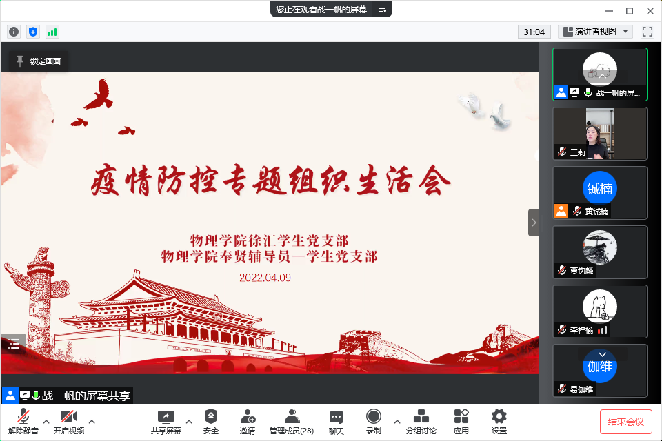 此外,党委副书记王莉同志还给学生党支部重点讲了《致徐汇校区同学们的一封信》、《关于奉贤校区进一步严格校园管理的通知》两份文件,同时举了很多近期学校疫情防控期间发生的多起违纪案例,要求所有学生引以为戒,所有党员要提高政治觉悟,坚决服从学校的各项管理规定,在广大学生群体中主动发声,做好舆论引导,加强关心关怀,特殊问题特殊对待,全力保障毕业班的顺利,以及其他同学们的学习、工作、生活稳定有序进行。