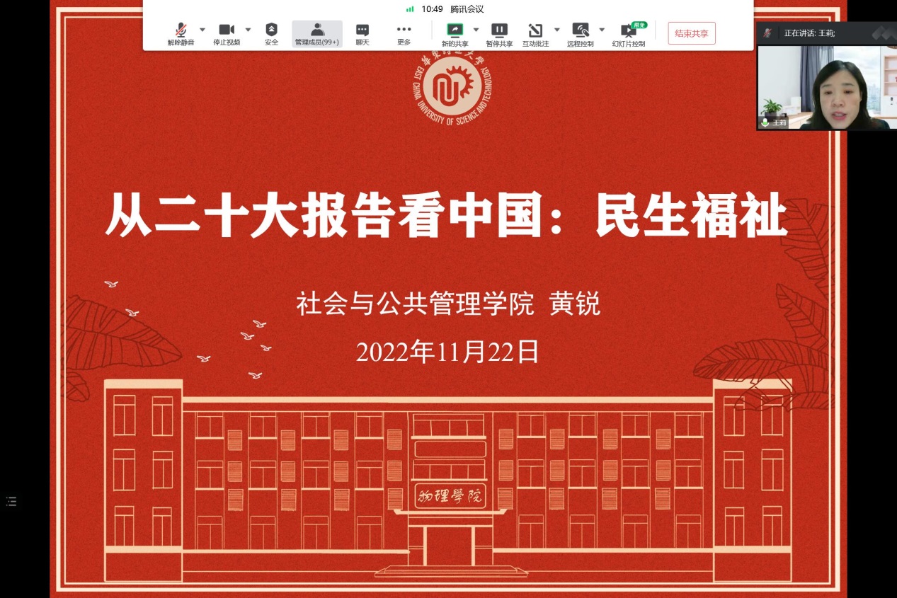 为深入学习宣传贯彻党的二十大精神,德赢winac米兰党委于1122日组织全体教职工开展理论学习。德赢党的二十大精神宣讲团成员、社会与公共管理学院黄锐副教授受邀作了题为“从二十大报告看中国民生福祉”的专题辅导报告。学院教职工及部分研究生、本科生200余人参加了此次学习,院党委副书记王莉主持了本次报告会。