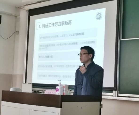 院长郑致刚代表学院行政班子作“凝心聚力担使命、踔厉奋发向未来、推进德赢winac米兰高质量发展建设新征程”的行政工作报告。他回顾了2022年学院在学科发展、本科教学、研究生培养、科学研究、安全与综合治理等方面的工作和取得的成绩,以及学院面临的困难与挑战。郑致刚表示,2023年学院将结合学校“双一流”建设总体方案,将重点工作围绕物理一级学科博士点高质量建设、应用物理学一流本科建设、本科教学审核评估展开,加强优势平台建设,全面提升学院的教学、科研和管理能力,促进立德树人和学科建设水平上一台阶。