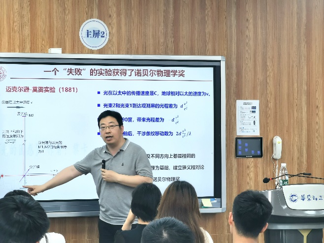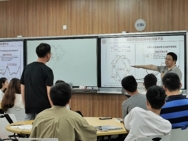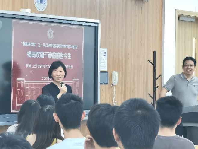 谁说大牛的报告听不懂?谁说学术的前沿太深奥?“专家引领明方向,思行合一共创新”!为了让同学们更好衔接学术前沿和专业课程内容,从课本出发,到学术前沿去,6月2日下午,上海交通大学物理与天文学院特聘教授何峰受邀走进大二年级《原子物理学》的课堂,带领同学们了解杨氏双缝干涉的前世今生,手把手教同学们做科研。何教授的报告围绕同学们正在学的最经典的双缝干涉实验,以深入浅出、通俗易懂的语言,不仅让同学们了解到相关知识的历史背景,更是让大家领略到如何理解、如何思考课本上的内容,以此贯通相关的学科前沿。互动环节,同学们踊跃提问,现场氛围轻松愉悦,启智润心,回味久远。