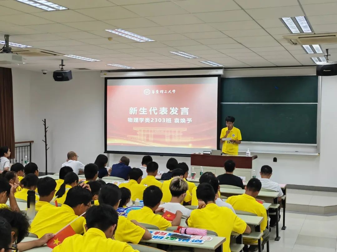袁焕予同学代表全体新生发言,他对华理的校园环境、学习环境表达了喜爱,回忆刚刚结束的军训生活,号召同学们尽快适应大学生活,勇敢追逐理想,积极进取,积极面对挑战。纵使有困难挫折,亦当砥砺奋进!