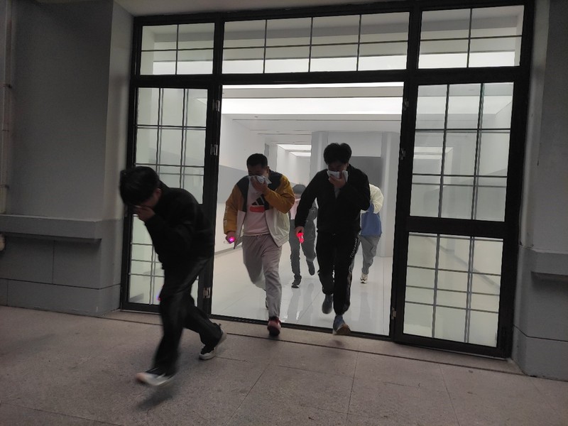 下午两点,演习总指挥、学院副书记吴舜宣布消防应急疏散演习正式开始。工作人员按照预案,在实验楼二楼南门两处门口点燃烟饼,实景模拟火场。顿时,浓烟弥漫,消防警报立刻响起。在安全引导员的有条不紊引导下,实验二楼各个办公室、实验室的师生们迅速低头行进,用湿毛巾捂住口鼻,有序地疏散撤离至安全区域。