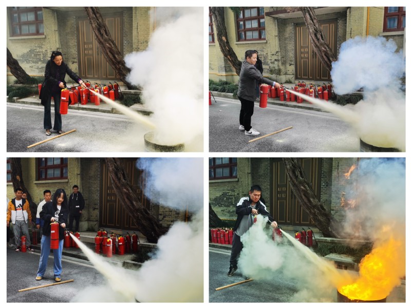 逃生疏散演练结束后,师生们来到图书馆西侧进行了灭火实操演练。保卫处黄志刚老师讲解了干粉灭火器的灭火原理和使用方法。随后,大家进行了灭火实操。