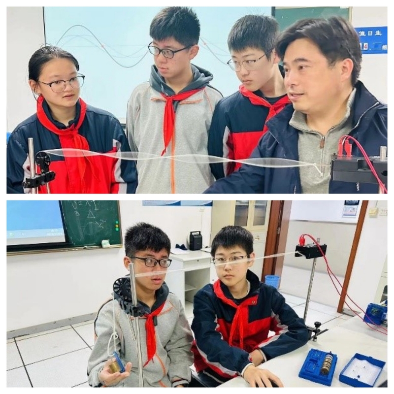老师们向学生们介绍了中学物理课上学到的有关声波知识,演示了弦上驻波振动现象,将波的传播特点和波包形成的原理深入浅出地描述给学生听,学生们看着细绳呈现出波叠加后的波包,都惊叹于物理现象是如此神奇,物理实验对探求真理的重要性。