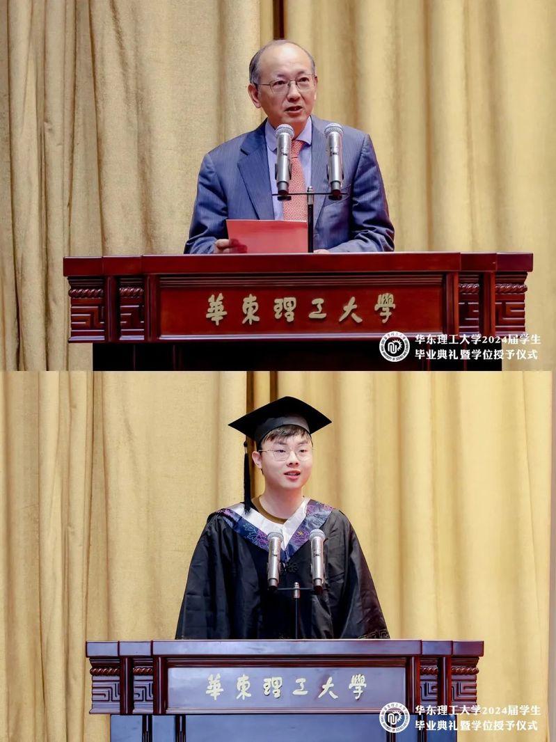 在学校主会场转播环节,德赢winac米兰物830班、浙江大立科技有限公司董事长、总经理庞惠民作为校友代表回忆了母校求学经历对自己生涯发展的重要意义,以自己选择科研实业报国、投身科技自立自强的经历,勉励同学们学会坚持,脚踏实地,从一个个小理想起步去实现更大的理想。德赢winac米兰本科生唐桤泽代表全体本科毕业生发言。作为“挑战杯”特等奖、“互联网+”国赛金奖、宝钢优秀学生特等奖获得者,他回顾了在华理的学习和创新实践经历,感恩学校对自己的培养,表达了深耕光电材料领域,争做新时代追光逐电者的远大志向。