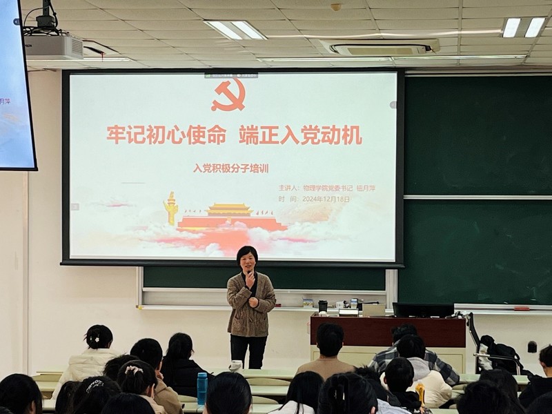 钮月萍先请同学们回忆了自己在入党申请书上写的为什么要入党,接着分别从革命战争年代、和平时期和党章规定等详细讲解了入党动机,以及“功利型”、“盲从型”、“虚荣型”等不正确、不成熟的入党动机,引导同学们永葆“为民”之心、“奋斗”之心和“奉献”之心,不断端正自己的入党动机。随后,她以钱学森、钱三强、严济慈、邹承鲁等科学家的入党故事和奋斗事迹,生动地阐释了党的吸引力和党员标准。最后,她从人才作为战略资源的角度讲解了人才强国的丰富内涵,勉励积极分子胸怀爱国之心,砥砺报国之志,继承和发扬老一辈科学家心系祖国、服务人民的优秀品质,肩负起时代赋予青年的重任!