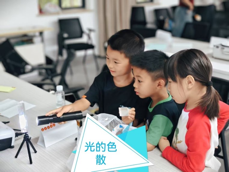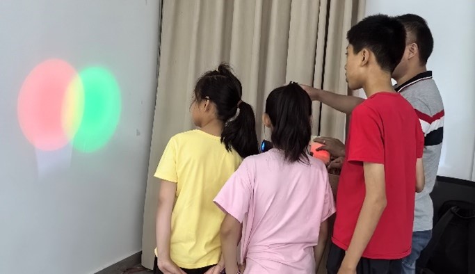 在光的色散实验台前,孩子们手持三棱镜,认真的调整手电筒的入射方向,当白屏上出现彩色光带时,惊喜不已;三基色配色实验区域,红、绿、蓝三色灯交织出绚烂色彩,孩子们亲手操作,见证不同颜色光混合出的奇妙变化;电生磁实验中,孩子们通过“大力士较力”实验,沉浸式地感受到了“电”与“磁”某种神奇的联系。