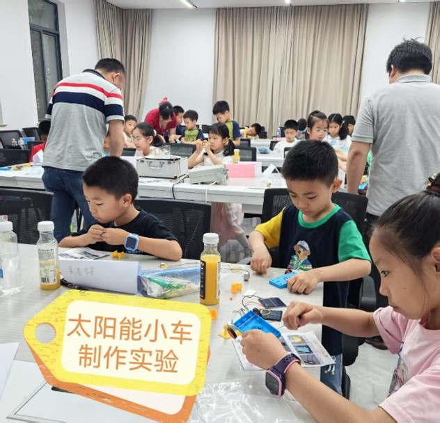 第二阶段的DIY亲子科普实践活动则让孩子们化身为小小科学家。碰撞实验通过调整斜面倾斜度、小车初始速度、障碍物、桌面粗糙度等参数,探索势能、动能、热能转化与动量守恒的奥秘。孩子们还通过多组协作,设计出各种花样的碰撞实验,玩得非常开心。最受期待的万向轮太阳能小车组装环节将活动推向高潮,亲子家庭齐心协力,孩子们也互帮互助,参照说明书和老师的指导,一步步将太阳能板、电机、万向轮、车轮等零件组装成小车。终于完成了,孩子们拿着自己组装好的作品,脸上都洋溢着自豪与喜悦。因为下雨,原计划太阳下的小车比赛暂不能进行,有些许的遗憾,但孩子们表示,等到阳光灿烂的日子,一定到室外去检验作品,要让自己的小车飞速跑起来!