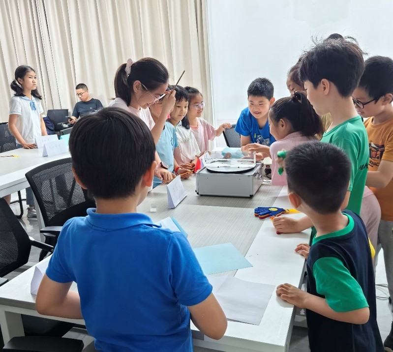随后的趣味物理演示实验与体验区,成了孩子们探索科学的乐园。水波共振实验台前则围满了小观众,当调节音频输入频率,观察到平静的水面上泛起涟漪、逐渐又形成了稳定的高低起伏的波涛、水波节数不断变化等奇特景象时,孩子们瞪大了眼睛,有的说“声波从这里发出”,有的说“又反射回来了”,有的说“水发生共振”,你一言,我一语,不断传来孩子们的笑声与讨论声。