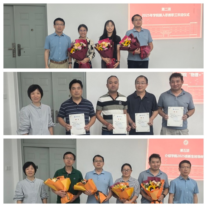 会上,开展了2025年新教工欢迎仪式、学院“物理+”工作室第三批指导教师聘任仪式、向2025级新生班导师献花等活动,进一步增强学院教师归属感、认同感和凝聚力。通过集体观看“2024-2025学年学院教职工获奖风采展”,共同回顾了学院教师在教学、科研、管理、服务等各方面取得的成绩,鼓励和引导教职工向优秀代表学习,立足岗位、甘于奉献,融入和推动学院各项中心工作。